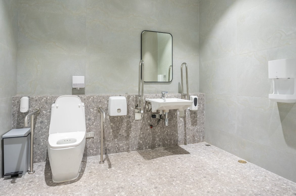 Complete refurbishment of restrooms, including toilets, showers, and a fully accessible disabled access toilet.